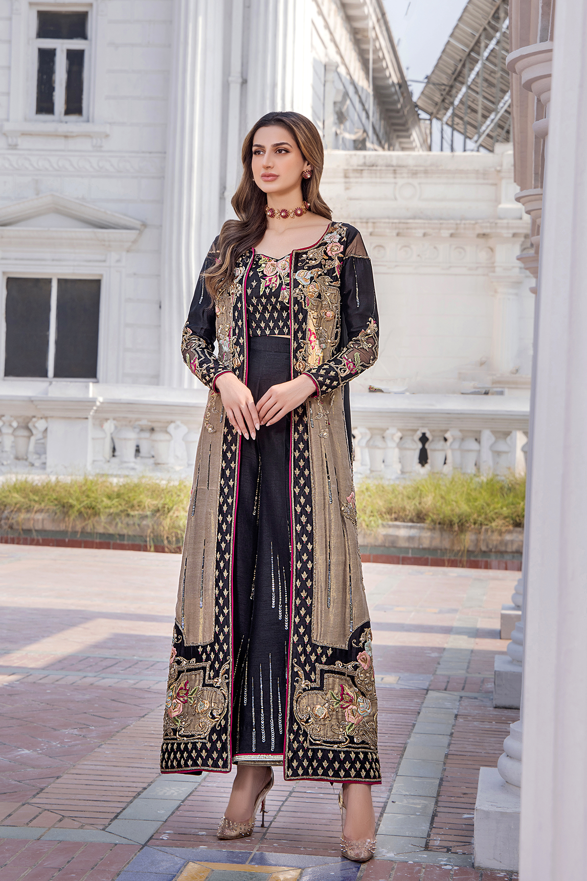 This black-and-gold cape-style gown, adorned in vibrant gold and pink embellishments, is nothing short of a masterpiece. The curated blouse mirrors the vibrancy, while sleek pants add a touch of modernity. The ensemble effortlessly blends sophistication and style.