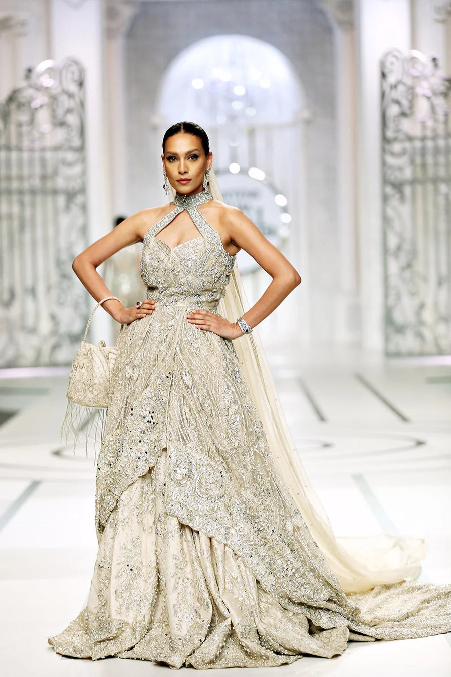Bridal Lehenga Design Dress for Wedding Wear is a Glamour that meets opulence in this ethereal cappuccino and silver bridal masterpiece. The signature motifs frock is paired with lehenga in jamawar derived from visually divine blossoms that are hand-colored and embellished with zardozi lining that moves beautifully around the body offering out worldly elegance and utmost comfort. Dupatta in the net fabric can be customized separately.