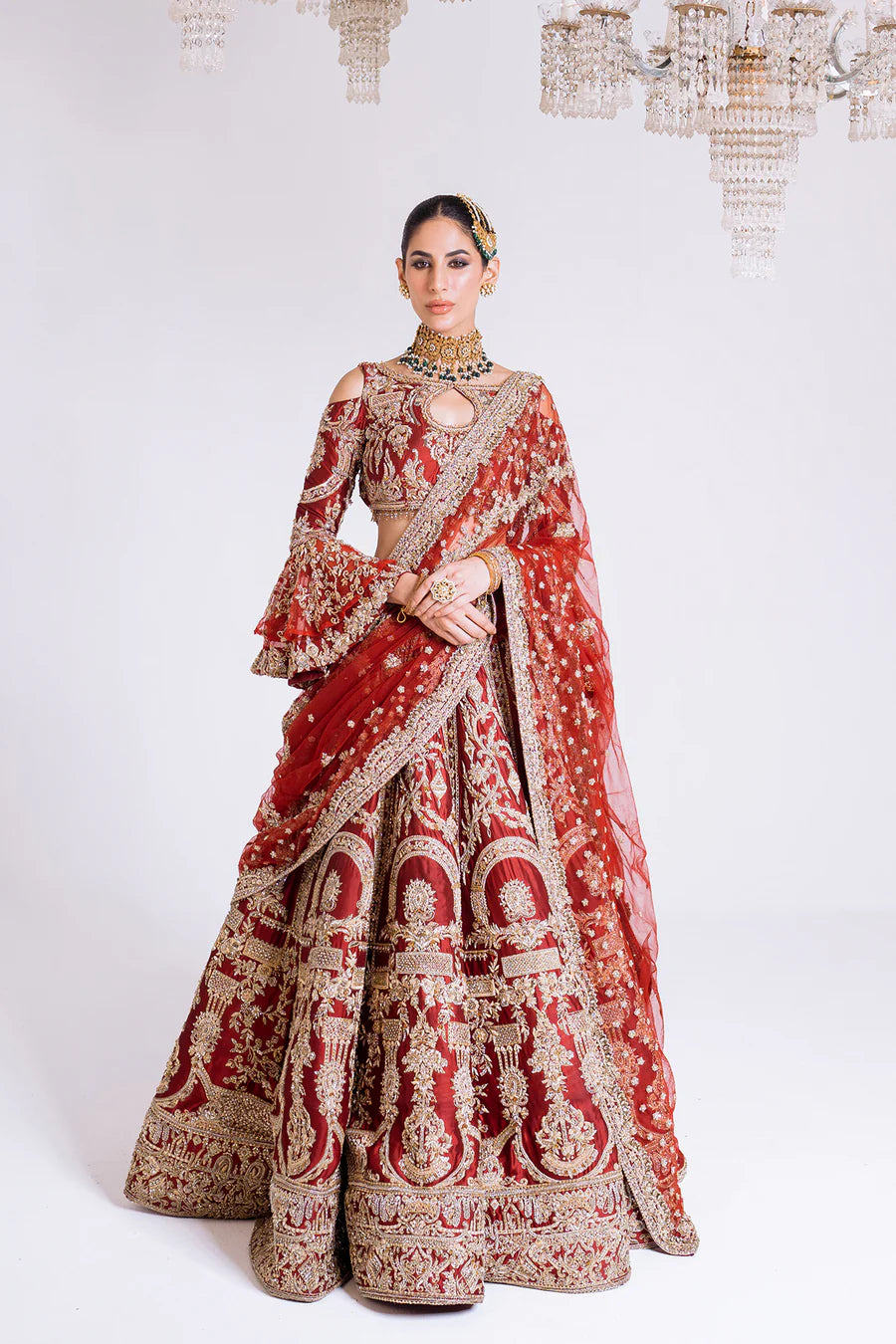A symphony of luxury, the crimson bridal lehenga choli embodies regal splendour. Bathed in resplendent gold, the fabric shimmers with celestial radiance. Flared sleeves dance gracefully, while the neckline stands as an artful masterpiece. The ensemble is a testament to timeless beauty.