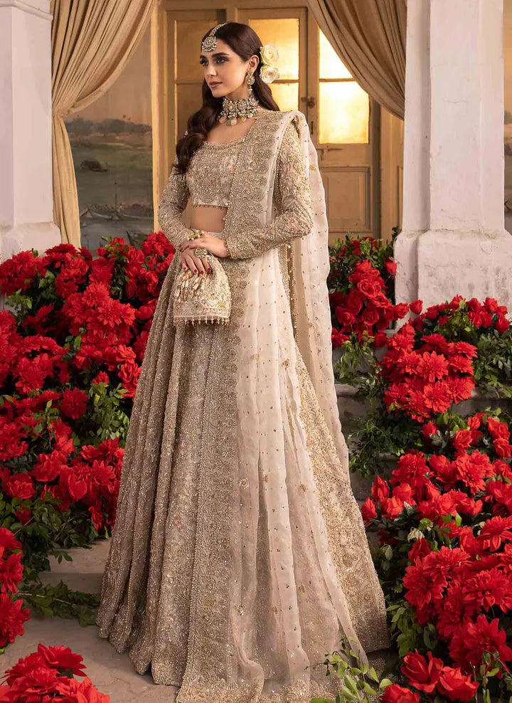 This Bridal Lehenga is intricately emblazoned with hand-worked zardosi, tilla, and lavish designs. The Pakistani Bridal Lehenga has a huge flare and is gracefully embellished with shimmering ornaments, goldwork, embroidery, stones, beads, stunning pearls, and motifs.