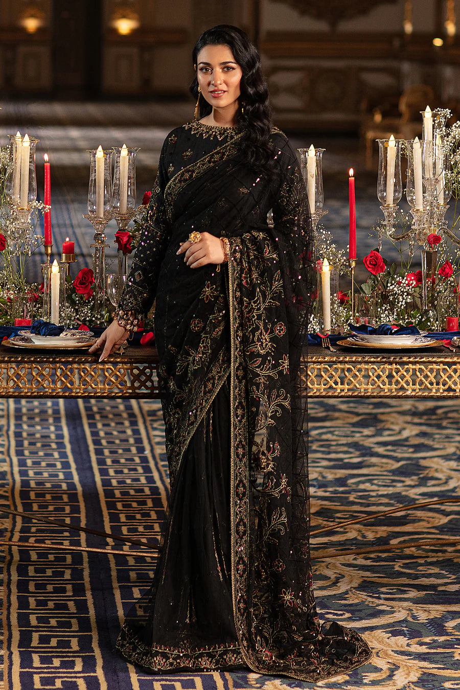 Hainoor is a work of art on a black canvas. The blouse is bejeweled with hand adda embellishments, thread embroidery & sequins all over it along with dangling hangings & cutwork details on sleeves & handmade tassels on the back. The saree itself is a work of art with its lustrous embroidery details along with sequin work. The border of the saree is heavily embroidered with thread & sequin, finished with viscose fusing & lace. Outfit comes with pk raw silk petticoat.