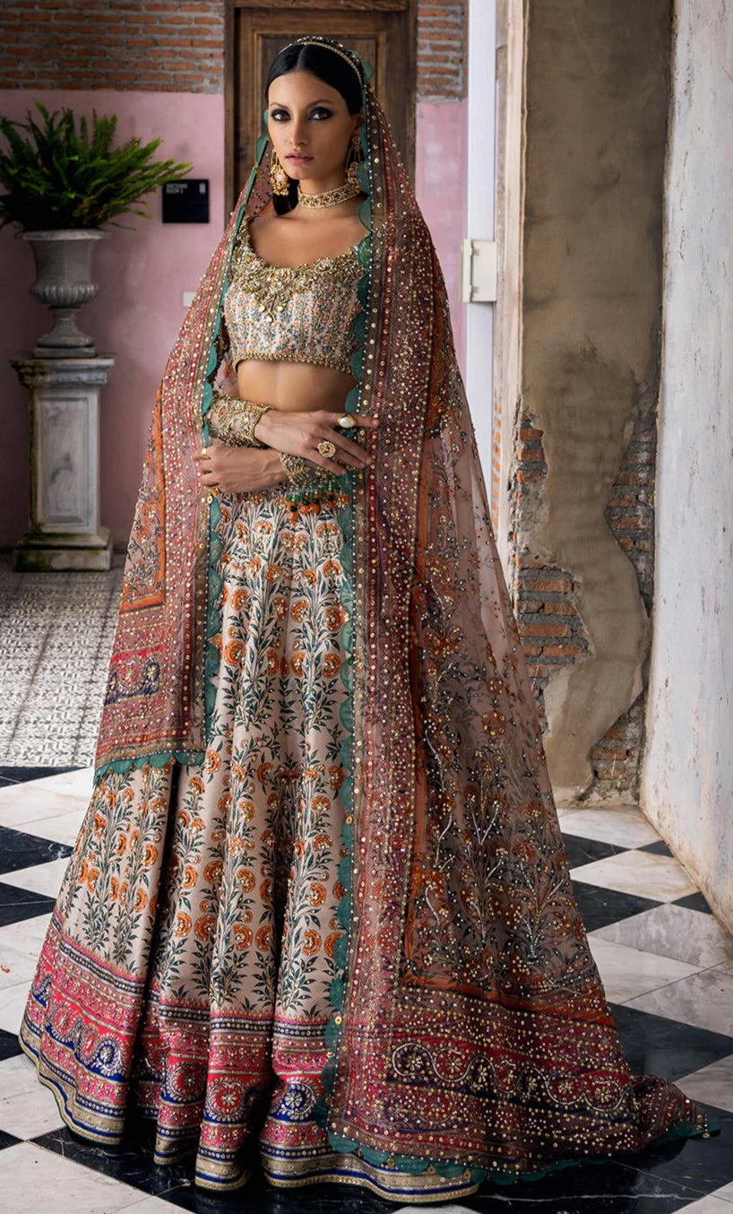 This Bridal Lehenga is intricately emblazoned with a beautiful print. The lavish contrast of orange and pink give a traditional look to this Indian Bridal Dress. Huge flare and hand-crafted details of sequins, stones, motifs, and crystals give a breathtaking look to this Lehenga Choli.