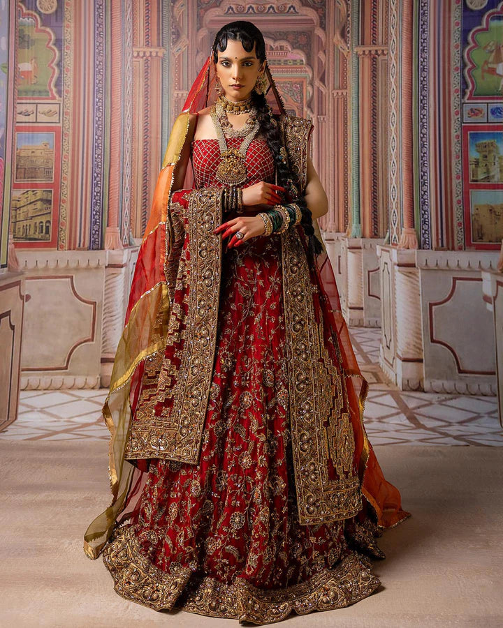 The Red Lehenga Choli is paired with a delicate dupatta to create a ravishing Indian Bridal Wear. The Bridal Dupatta is emblazoned with dabka, tilla, and embellished borders. Another multi-colored dupatta in organza is prepared on customized orders to pair with the Lehenga Dress.
