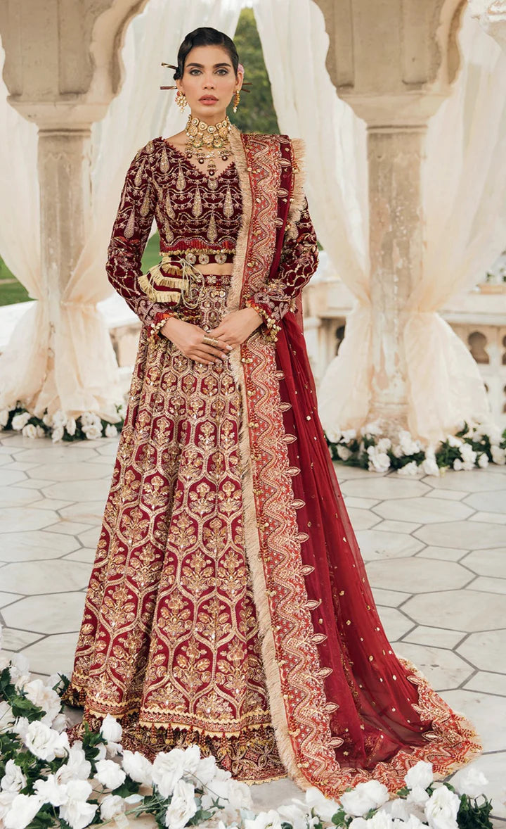 The bridal choli comes in an alluring maroon-red color and is emblazoned with classic goldwork and sequins. Lavish designs and fine details of motifs, pearls, and tilla make this beautiful choli a perfect choice to pair with Lehenga Dress.