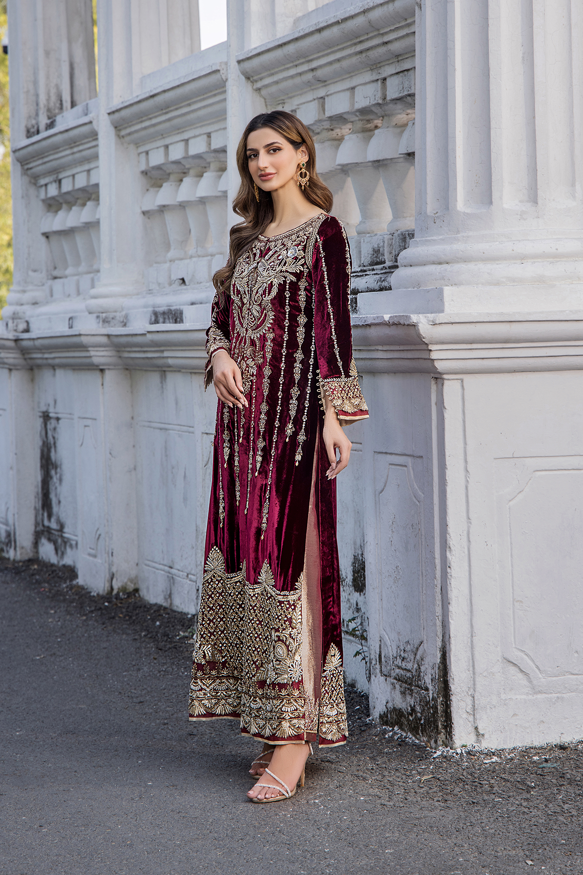 In the rich embrace of maroon's deep hue, discover a luxurious ensemble adorned with gold embellishments throughout the fabric. The heavy neckline adds opulence to this outfit, perfectly paired with trousers for an exquisite and refined look.