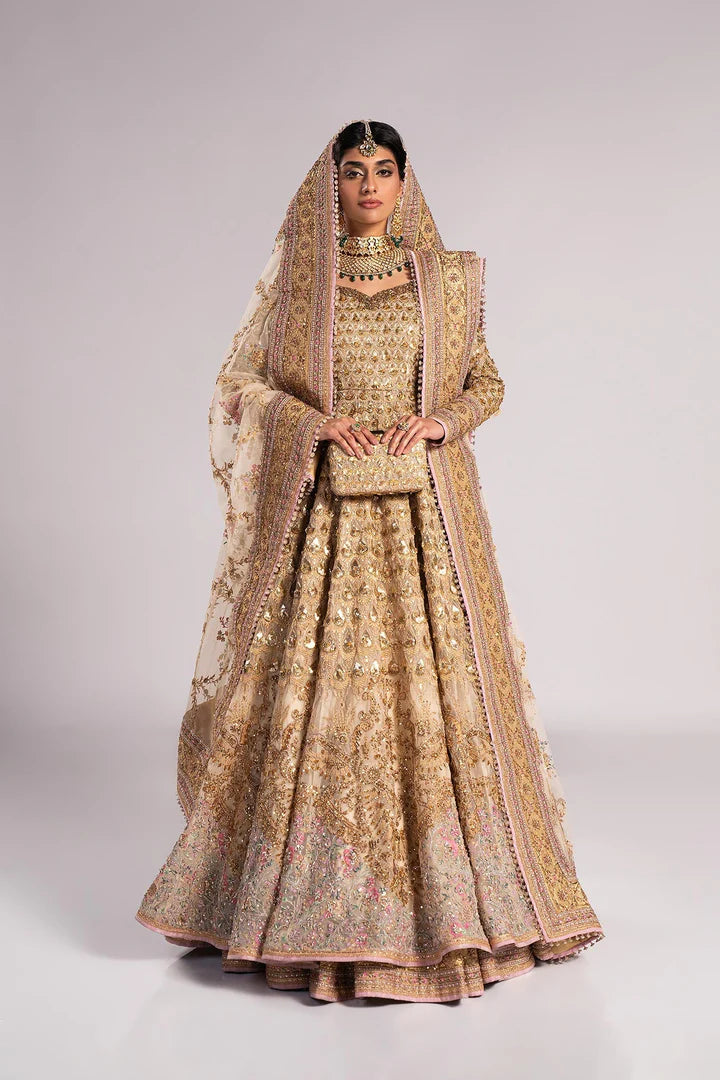 Pakistani Bridal Pishwas in an alluring ivory shade has premium net fabric. The Pishwas Frock is gracefully emblazoned with zardosi, dabka, gota, naqshi, gold ornaments, and motifs. The Traditional Pishwas is embellished with intricate designs and shimmering embellishments giving it a flawless finishing look.