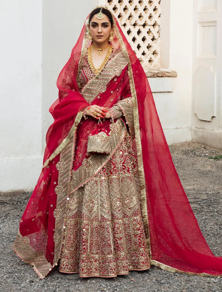 The choli comes in an alluring red color and is gracefully emblazoned with hand-crafted details of dabka, naqshi, and mukaish. Intricate designs and fine beaming details of pearls, sequins, and cut-dana make this choli a perfect choice to pair with a Bridal Lehenga.