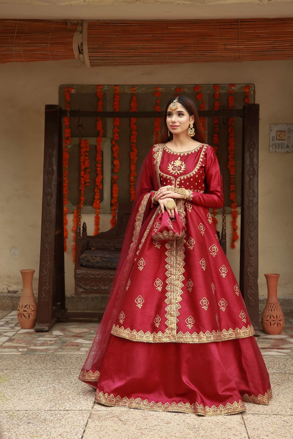 A divine burgundy raw silk painted with brilliant gold and enhanced by elaborate tilla machine embroidery all over the body and sleeves. The tassels on the back give this look a touch of elegance. This ensemble is the epitome of luxe with intricate detailing block printed by hand, an attached cancan that enhances its voluminous flare and a net dupatta to complete the look. Add a matching pouch that is both stylish and convenient!