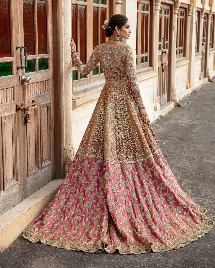 Lehenga: The embellished choli is paired with Lehenga to create a lavish Bridal Wedding Dress. The Lehenga has a huge flare which makes this attire a magnificent masterpiece. Dabka embroidery, zardosi, threads, sequins, tilla, and Resham give a royal look to the Lehenga Dress.